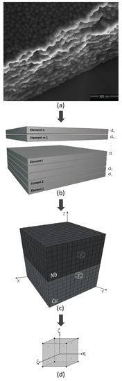 Sequential modeling steps from an actual metallic nano-layer image to a three-dimensional Cu/Nb nano-layer unit cell discretized into hexahedral elements are demonstrated in Figure 3.