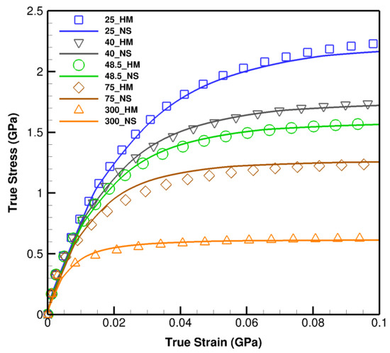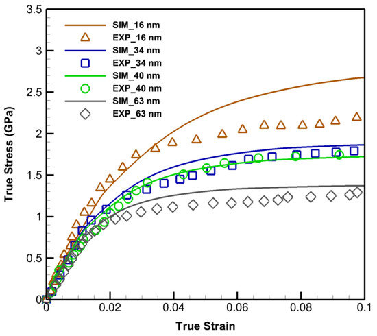 Since the developed models yield true stress-strain responses, an excellent agreement with 40 nm experimental data is observed due to the similarity of formats. Small divergences between the rest of the curves are related to the nature of the reported results, being engineering stress-strain, which naturally placed them in the lower positions than the true ones. The general trend of the computationally predicted properties is in agreement with the experimental data, however, the amount of deviation from 16 nm is related to the softening phenomenon at the sizes lower than about 20 nm [51,52] due to which this work is appointed its nano-scale size range from 20 nm to 1 m.