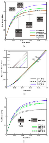 (a) True stress-strain curves for four thickness combinations of 34 nm and 63 nm as well as 48.5 nm Cu/Nb multi-layers illustrating the effect of layer combinations on the plastic deformation and flow strength. (b) Equivalent plastic strain versus true strain curves for the cases in (a) clarifying the size and layer geometrical order effects. (c) True stress-strain curves of 34 nm, 40 nm, and 63 nm Cu/Nb multi-layers demonstrating the effects of transverse (TRANS) and longitudinal (LONGL) loading directions plotted with solid and dash lines, respectively.