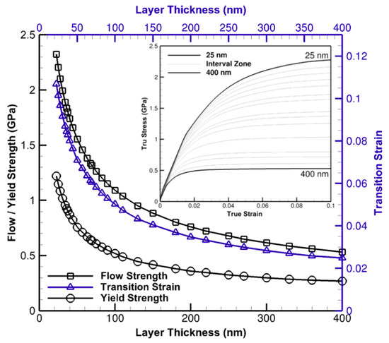 The significance of size effects is delineated in Figure 6 where the flow and yield strength as well as the transition strain in a wide nano-scale interval, 25 nm to 400 nm, are plotted. Considering the transition strain as the strain sustained from the yield to the onset of flow, a nonlinear descending trend of flow and yield strength is noted as layer spacings decline. Yield points are recognized when the resulted data from computational analyses start to deviate from the linear trend, albeit, with a tolerance consideration, and transition strains are detected once a hardening trend and the tangential line of a post-yield curve intersect. The increase in strain transition is primarily due to mechanical thresholds and dislocation structure evolutions aligned with low strain hardening and dynamic annihilation-recovery mechanisms. A small variation in thickness results a dramatic change in flow and yield strengths at the thicknesses of ⪅100 nm.