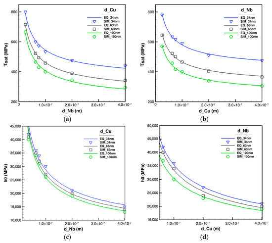 From another angle, the increase of temperature degrades the mechanical responses of a thin metallic nano-layer to a thicker one at room temperature; this can be clearly perceived in Figure 9a where a 34 nm Cu/Nb at 400 °C exhibits the strength of a 63 nm Cu/Nb at 25 °C.