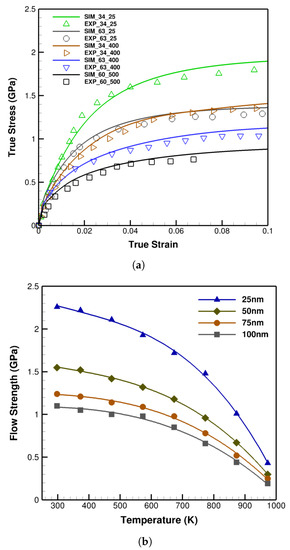 (a) The validation of the temperature-dependent constitutive model with 34 nm, 60 nm, and 63 nm Cu/Nb laminates at 25 °C, 400 °C, and 500 °C. Symbolic points are the experimental (EXP) [49,55] and solid lines the simulation (SIM) data. (b) Flow strength versus temperature curves of 25 nm, 50 nm, 75 nm, and 100 nm Cu/Nb laminates at 25 °C up to 700 °C demonstrating the nonlinear effects of temperature growth on flow strength.