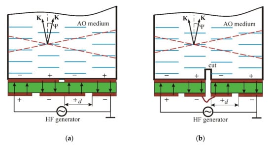 However, such a cell was very difficult to manufacture, so planar structures were then proposed [,,,,]. A planar structure is shown in Figure 1; in the first variant (Figure 1a), one piezoelectric plate (shown in green) is used, and separate sections are formed by partitioning the internal and external electrodes. In another case (Figure 1b), the internal electrode is first made solid, and then grooves are sawn at the final stage. The pictures show the AO cells with transducers containing four sections that are connected electrically in series, but in such a way that the direction of the electric field (shown by the arrows) in the adjacent sections is opposite. Due to this, acoustic beams from each section are excited with a phase shift of , and a system of equivalent wavefronts (shown by two dashed lines) is formed, turned by an angle relative to the transducer plane. This angle is determined by the expression: