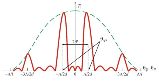 In comparison with a homogeneous (nonsectioned) transducer, here, the transfer function of the AO cell contains two main maxima, which are located symmetrically with respect to the Bragg angle , as shown in Figure 2 with the red curve. It follows from the figure that AO diffraction is absent when the light beam falls at the Bragg angle (). This is due to the fact that partial diffracted waves generated in neighboring acoustic beams are phase-shifted by and therefore dampen each other during interference. However, there are other maxima situated equidistantly with the period , which are inscribed into the dashed green curve showing the radiation pattern of a separate section of the transducer. The width of the maxima is equal to , where m is the number of periods of the transducer array. Thus, we can conclude that in the case of the phased-array transducer, the concept of the Bragg angle as the angle of light incidence, at which the phase-matching condition is fulfilled and the maximum diffraction efficiency is observed, is incorrect. Here, we can talk about the optimal angles of light incidence , which correspond to the maximal scattering of light, although the phase-matching condition is violated. It can be noticed that these optimal angles conform to the conventional Bragg angles when light falls on the equivalent wavefronts. Consequently, such a structure of the acoustic field can be considered as a superposition of two fields excited by two solid piezoelectric transducers rotated relative to each other by the angle . Our calculations show that the diffraction efficiency here can reach 100%, despite a noticeable phase mismatch. However, this requires slightly higher acoustic power [,].