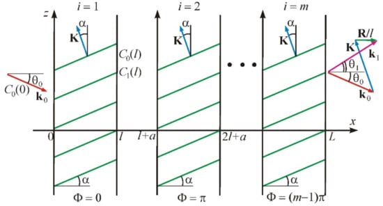 Figure 3 illustrates the problem in the most general case of an anisotropic medium in which acoustic beams propagate with a walk-off angle . We assume that the inclined phase grating created by the acoustic wave occupies the area of space between the infinite planes and . The wave vector of ultrasound is inclined at an angle . The width of each acoustic column is l. Therefore, the second column occupies the space between the planes and , where a is the gap between the acoustic beams, etc. Thus, the period of the transducer structure is . The initial acoustic phase in the first column is equal to , and in the following column, is ; at that time the phase shift between the adjacent beams is equal to . The total number of beams is m.