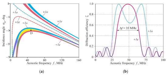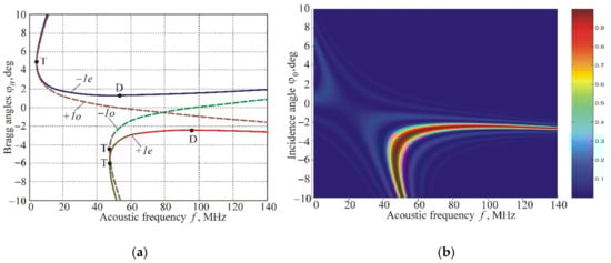 Figure 4a demonstrates the frequency dependences of the Bragg angles for optical wavelength µm. The four curves correspond to different polarizations of incident light (ordinary “o” or extraordinary “e”) and to the scattering of light into the +1st or −1st orders of diffraction. For example, branch +1e characterizes the diffraction of the e-wave into the +1st order. Points D and T indicate areas optimal for AO deflectors and video-filters, respectively [,,].