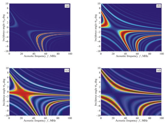 We can see from Figure 5 that, for large periods of the transducer structure, a common area of AO interaction splits into two symmetrical domains (Figure 5a). Then, an additional domain appears from the side of low ultrasound frequencies (Figure 5b). Thereafter, the left domains merge and form a common area with a very complex shape (Figure 5c). Finally, this area splits, and three nonoverlapping domains form (Figure 5d). It should be noted that such unusual dynamics of AO interaction areas differ significantly from the variant of a homogeneous (nonsectioned) acoustic field. This can be considered as an advantage of the phased-array transducers because the optimal geometry of interaction in the most convenient frequency range can be obtained when designing AO devices.