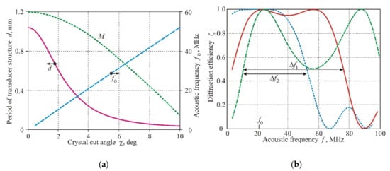 Figure 6 displays the characteristics of this unusual AO geometry. In Figure 6a, the operating frequency , which corresponds to the coinciding points D and T, is presented in the dependence of the crystal cut angle and the period of the transducer structure . The divergence angle between the incident and diffracted beams (important characteristic for video-filters) increases with the acoustic frequency according to the formula . Unfortunately, this positive dependence is accompanied by a decreasing AO figure of merit M (green curve in Figure 6a), which falls from a maximum value s3/g at to s3/g at [].
