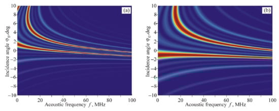 The basis of modern acousto-optic (AO) devices, applied in systems of optical information processing, is an AO cell that is usually made of a crystal with a certain cut. Ultrasonic waves are excited by piezoelectric plates attached to one of the cell faces. In these instruments, a type of light diffraction by ultrasound close to the Bragg regime is usually used [,,]. This regime is realized at sufficiently high acoustic frequencies (usually over 100 MHz) and allows us to create devices with good performance and low light loss. However, as a disadvantage, this type of interaction has high selectivity, which means the AO effect magnitude has a strong dependence on the frequency of ultrasound f, the angle of light incidence and the wavelength of optical radiation . An important characteristic of the effect is the Bragg angle . When the light beam falls at a Bragg angle (the phase-matching condition), the most effective light scattering into the diffraction order occurs, and a decrease in the diffraction efficiency by 3 dB determines the boundary of the AO interaction region.
