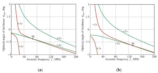 The comparison of the AO interaction areas for the branches +1e and +1o allows us to note another interesting and practically important feature, which is fundamentally impossible in the case of AO diffraction in the homogeneous acoustic field. Figure 8 demonstrates the frequency dependences of the optimal angles of light incidence , combined for branches +1e and +1o. The graphs show that the curves, belonging to different diffraction orders +1e and +1o, intersect at the point M at the frequency f = 67 MHz (Figure 8a) or f = 134 MHz (Figure 8b). This means that, at these frequencies, the optical waves with ordinary and extraordinary polarizations have to diffract into the same diffraction maximum of the +1st order. Such AO interaction geometry makes it possible to modulate the intensity of unpolarized light beams without optical losses.