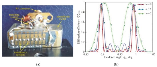 Frequency characteristics of this deflector for the incidence angle are presented in Figure 9b. The two curves relate to different polarizations of the incident light. It can be seen that the common frequency band is MHz. This means that such a deflector can provide optical beam scanning in an angular range of with spatial resolution resolvable points when the optical aperture of the AO cell is cm.