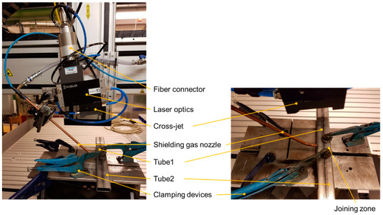 Setup for the laser welding experiments of tubes showing the large view with all components (left) and the detailed view of the clamped work piece (right).