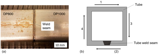 A typical WJ on a tube is shown in Figure 2a. For mechanical testing, the sides 1, 3 and 4 were used due to the tube weld seam alongside 2 (Figure 2b). For minimization of distortion effects on subsequent welding, the welding sequence in Figure 2b was chosen.
