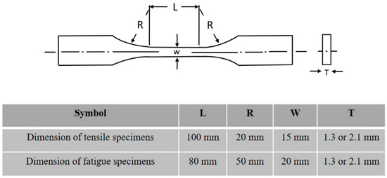 Tensile and fatigue test samples were prepared following the ASTM E466-96 standard [27] with the geometry and dimensions shown in Figure 3. The samples were sectioned from the welded work pieces with the weld positioned at the center of the gauge length. The fatigue tests were carried out using Instron servo-hydraulic universal testing machine (Instron. Co. UK., High Wycombe, UK) equipped with data acquisition and hydraulic pressure grips at a frequency of 20 Hz and with a stress ratio of 0.1.