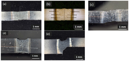 Crosssections of the different types of WJs. (a) DP800/1.3-DP800/1.3; (b) DP1000/1.3-DP1000/1.3; (c) DP800/1.3-DP1000/1.3; (d) DP800/2.1-DP800/2.1; (e) DP800/2.1-DP1000/1.3.