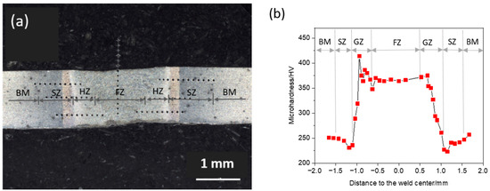 Measurement points of microhardness at the welded joints across the BM, SZ, HZ and FZ. BM: base metal, SZ: softening zone, HZ: hardening zone, and FZ: fusion zone.