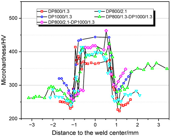 The microhardness profiles across the five types of WJs are shown in Figure 6. Consistent trends were found for the different types of WJs, featuring peaks in the HZ and valleys in the SZ. The lowest microhardness values in DP800/1.3-DP800/1.3 and DP1000/1.3-DP1000/1.3 WJs were between 220 and 275 HV, which was 8 and 20% lower in comparison with the corresponding base material. In addition, the width of SZ in DP800/1.3-DP800/1.3 WJ was around 0.49 mm, narrower compared with the DP1000/1.3-DP1000/1.3 WJ with the value of ~0.75 mm. This agrees with the results reported that the softening degree and the size of soften zone was increased with increasing strength grade of the steels [17,18]. The DP800/2.1-DP800/2.1 WJ had wider SZ (~0.54 mm) and higher microhardness in the FZ compared with DP800/1.3-DP800/1.3 WJ. A comparison of the WJs for combinations with dissimilar materials with those of similar materials showed that the SZ of DP800/1.3-DP1000/1.3 WJ at DP800 side was wider, while similar width was observed at the DP1000 side.