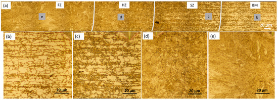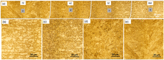 The BM DP800 was characterized by martensitic islands in a ferrite matrix, as shown in Figure 7b. The microstructures at the SZ were composed of coarse grains of ferrite and probably tempered martensite as shown in Figure 7c, with minimum hardness values in the hardness profiles. The volume fraction of ferrite towards the FZ was decreased, indicating partial transformation of ferrite. Martensite and ferrite at the HZ were observed, and the grain size was bigger near the FZ (Figure 7d). The FZ was dominated by lath martensite, and the grain size was larger compared to that in BM (Figure 7e).