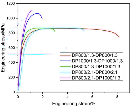 The representative engineering stress versus engineering strain plots of the tensile tested weldments are displayed in Figure 9. The stress–strain curve of the DP800/1.3-DP1000/1.3 weldment was located between that of DP800/1.3-DP800/1.3 and DP1000/1.3-DP1000/1.3 weldments.