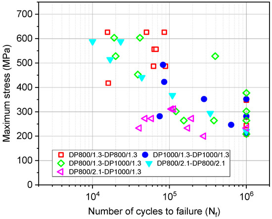 Fatigue test results of the weldments obtained at R = 0.1, 20 Hz, and room temperature (RT) are plotted in Figure 10. The limit for run out (RO) was set to 1 million cycles (106). The stress level target for the RO was set to 200 MPa. The results show that, although the points were scattered, probably due to the defects introduced during the welding process, it still can be observed that the DP800/2.1-DP800/2.1 weldment had a lower fatigue life than the DP800/1.3-DP800/1.3 weldment at both high and low levels of stress. An interesting finding in the comparison of these two weldments is that the thicker sheet combination (2.1 mm) shows lower scatter of the results in comparison with the thinner sheet (1.3 mm). The DP800/2.1-DP1000/1.3 weldments exhibited the lowest fatigue life in comparison with the other weldments with a RO stress below 200 MPa.