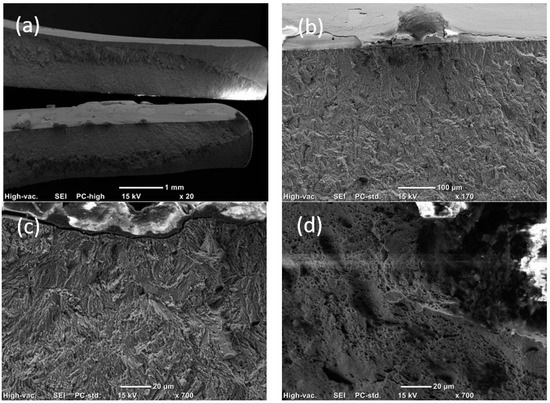 SEM images of fatigue fracture surface of a DP800/1.3-DP800/1.3 weldment tested under a maximum stress of 626 MPa are shown in Figure 12. Multiple crack initiation points were found, located at the surface, as shown in Figure 12b. Figure 12c illustrates the fatigue striations in the crack propagation region. The dimples in the final fast crack propagation region indicated the plastic fracture (Figure 12d).