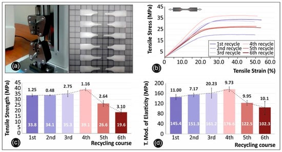 In Figure 4 below, the tensile testing setup utilized in this work is depicted (Figure 4a), alongside with the fractured specimens after the tensile test experiments (Figure 4a), the comparative graphs of the tensile stress versus strain (Figure 4b), the average tensile strength and the deviation in each recycling step (Figure 4c) and the average tensile modulus of elasticity and deviation (Figure 4d) for all six (6) recycling courses.
