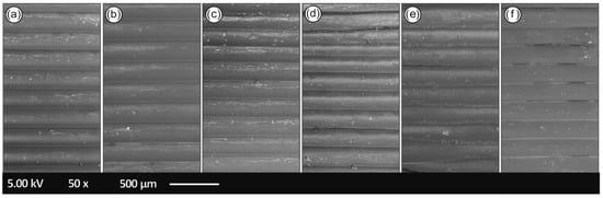 Specimens’ side surface SEM images: (a) 1st recycling course, (b) 2nd recycling course, (c) 3rd recycling course, (d) 4th recycling course, (e) 5th recycling course and (f) 6th recycling course.