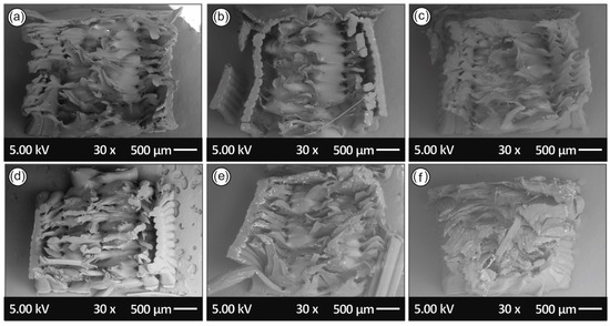 Scanning electron microscopy (SEM) characterization was performed for the morphological characterization of specimens’ internal/external structure and interlayer fusion via fractured surfaces’ microstructural analysis and 3D printed samples side surface morphology, respectively. The SEM analysis was carried out using a JEOL JSM 6362LV (Jeol Ltd., Peabody, MA, USA) electron microscope in high-vacuum mode at an accelerating voltage of 5 kV.