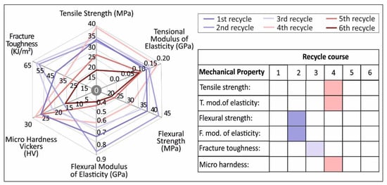 Flexural properties show a similar behavior. Flexural strength (and flexural modulus of elasticity) starts to decrease after the 2nd recycling step and significantly decrease after the 4th repetition. More specifically, the peak value in the flexure strength is visible in the 2nd recycling course in this case with a value of 44.1 MPa. This indicates an increase in the flexural strength of 15.4%, when compared to the virgin material. Flexural modulus of elasticity follows the same trend with a peak value of 882.6 MPa in the 2nd recycling course. In a similar way, from Figure 5b, stress/strain curves’ slope, it is derived that the 2nd recycling course specimens shown a “stiffer” behavior.