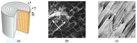 The wood material axes on a log view (a); scanning electron microscope photograph of a RT plane at 746 times magnitude (b); and scanning electron microscope photograph of a LR plane at 533 times magnitude (c).