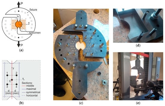 The Arcan fixture: (a) scheme; (b) the explanation of measuring points/sections; (c) physical fixture; (d) distances and tooth plates; and (e) experimental setup with the DIC system.
