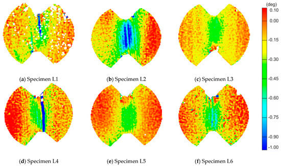The post-processing of strain values was performed in the DIC software. Maps of the shear angle and charts at the moment just before failure for all six LR,L specimens are shown in Figure 5 and Figure 6, respectively.