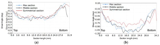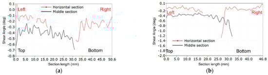 The shear angle plots along critical sections for LR,R-type specimens: (a) Specimen R2; and (b) Specimen R6.