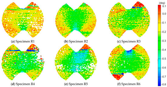 The shear angle maps just before the failure for each LR,R-type specimen: (a–f) for each of the samples from R1 to R6 respectively.