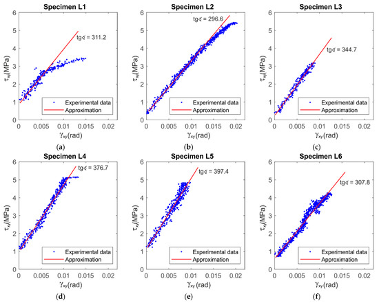 Charts of the relationship of shear stress–shear angle at the central point for LR,L specimens with their linear approximation: (a–f) for each of the samples from L1 to L6 respectively.