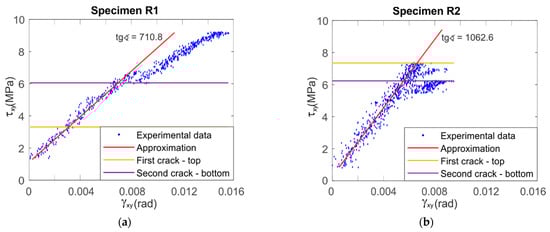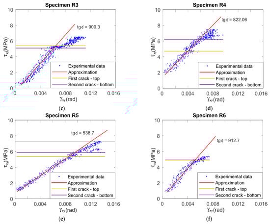 Figure 9 and Figure 10 show the stress–strain relationships for LR,L and LR,R specimens, respectively. The shear angles were taken from Expression (2) for the central point. The red lines show a linear fit in the range of results from 0.25 of the ultimate force up to the moment of failure. The LR,L specimens present a brittle failure (Figure 9), while LR,R present a linear behavior up to the first crack. After the crack, the specimen is changing the configuration and the specimen is slightly rotating and deforming, which is why the experimental points seem to lay on each other, due to stress loss after the crack, especially on the specimens shown in Figure 10b,e. The obtained LR,L average modulus of shear is approximately 350 MPa, while that of LR,R is approximately 840 MPa. These results are similar to those shown above in Table 1 and Table 2. This confirms the validity of the previously adopted methods.