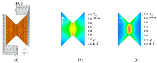 Distributions of the shear stress for different configurations of the specimens: (a) the finite element mesh; (b) Specimen LR,L; and (c) Specimen LR,R.