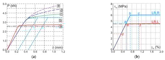 The value 2.90 kN of the ultimate external force corresponds to the moment of the first crack appearance. The second crack appears with an average load of 3.30 kN, which is closer to the numerical result. The hardening effect similar to the experimental results is visible in Figure 10 and can be easily controlled by the appropriate selection of Ks parameter. Lines [c]–[e] in Figure 13a are an example of the possibilities offered by the model. The exact fit will be the subject of further research. Figure 13b shows the relationship between shear stress and strain in the central point. Red Line [a] is for Specimen LR,L and perfect plasticity (Ks = 0). The obtained maximum strength was 4.50 MPa, which corresponds to the adopted value of the shear strength (). Blue Line [b] is for Specimen LR,R and perfect plasticity (Ks = 0). Again, the obtained maximum strength 6.0 MPa corresponds to the adopted value of the shear strength (). The slope in the elastic range is consistent with the adopted value of the modulus. Another path to destruction has been observed. For the test in the LR,L configuration, the first active was the shear criterion, while, in the LR,R configuration, the tensile criterion was activated first. Points marked with letters a and d shown in Figure 13b correspond to the first moments of reaching the failure criterion.