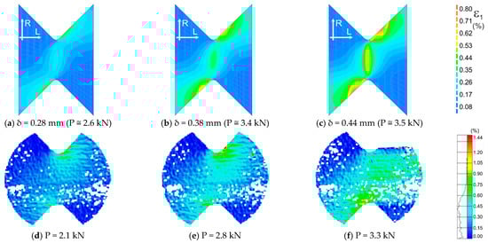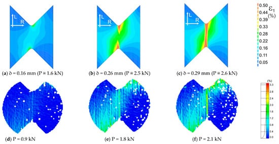 Comparison of the maps of the maximum principal strains obtained numerically (a–c) and calculated from displacements measured by the DIC method (d–f) for LR,R orientation.