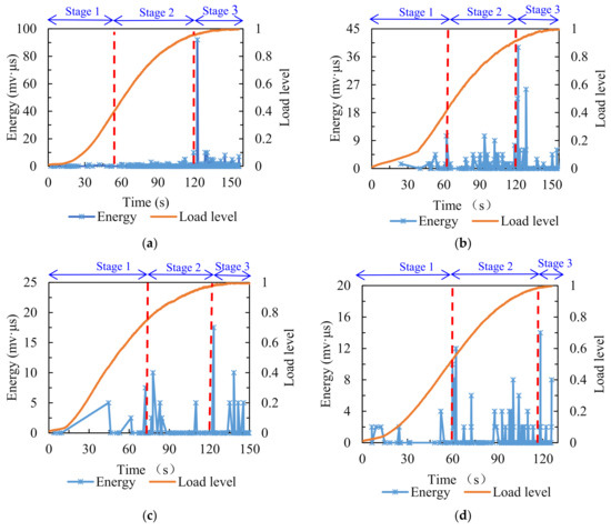 - Meng, Q.; Zhang, M.; Han, L.; Pu, H.; Nie, T. Effects of Acoustic Emission and Energy Evolution of Rock Specimens Under the Uniaxial Cyclic Loading and Unloading Compression. Rock Mech. Rock Eng 2016, 49, 3873–3886. [Google Scholar] [CrossRef]