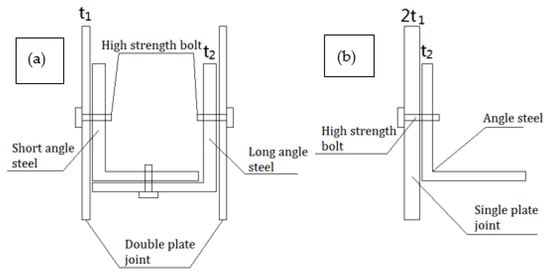 When the joint is connected by PSLSPJ, the load acts on the angle steel, which is eccentric for the gusset plate. The gusset plate will be subjected to the tensile and compressive load from the angle steel, and the bending moment caused by eccentricity will increase the stress at the plate end, which may lead to the damage of the gusset plate. Generally, the normal use of the member is ensured by increasing the thickness of the gusset plate. However, it will increase the weight of the overall structure and waste of materials. For the gusset plate of PDLDPJ, the connection with angle steel makes the gusset plate tend to bear axial force, which can greatly reduce the stress of the gusset plate. Connection form between the gusset plate and angle steel of the two joints is shown in Figure 3.
