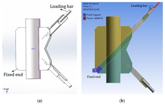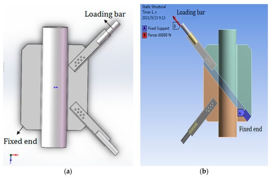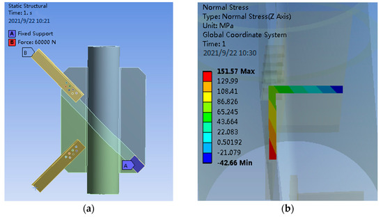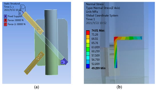 Figure 7. (a) Angle steel axle load diagram of PSLSPJ; (b) finite element results of PSLSPJ.