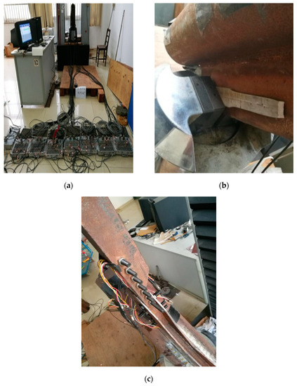 (a) Test loading device and strain acquisition system; (b) PSLSPJ installed on testing machine; (c) PDLDPJ installed on testing machine.