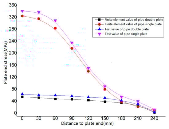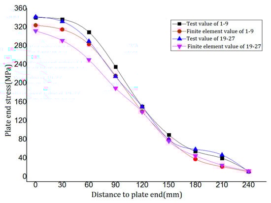 The finite element model is established according to the specimen size, loading, and restraint mode used for subsequent tests, the model is loaded, the path along the weld direction is established on the gusset plate, and the equivalent stress on the path is extracted. As shown in Figure 9, the plate end stress of PSLSPJ and PDLDPJ is compared to verify the relationship with the theoretical solution.