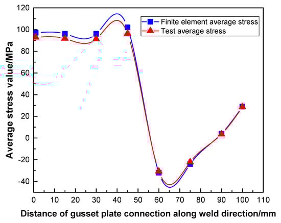 According to the data in Table 2, the relationship between the test value along the weld direction and the finite element value on the gusset plate of PSLSPJ is obtained, as shown in Figure 17.