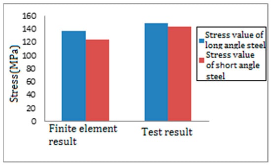According to Table 3, the average stress of long and short angle steel along the weld direction on the joint plate of PDLDPJ can be obtained in the test and finite element. Numbers 1–4 and 23–26 are the stress values on the front and back of the weld, respectively. Take the flat value of the stress on the front and back to obtain the comparison results of the test and finite element, as shown in Figure 18.
