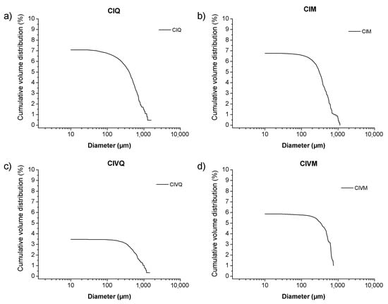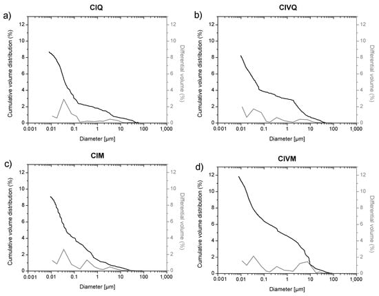 MIP cumulative volume distribution (black) and differential volume (gray) of samples (a) CIQ, (b) CIVQ, (c) CIM and (d) CIVM.
