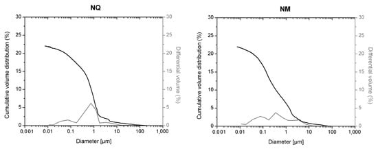 MIP cumulative volume distribution (black) and differential volume (gray) of samples with natural hydraulic lime (NQ, left, and NM, right).