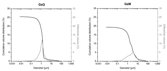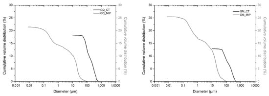 MIP cumulative volume distribution (black) and differential volume (gray) of samples with gypsum (GsQ, left and GsM, right).