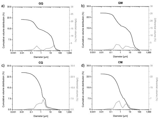 MIP cumulative volume distribution (black) and differential volume (gray) of samples with aerial lime: (a) GQ, (b) GM, (c) CQ and (d) CM.
